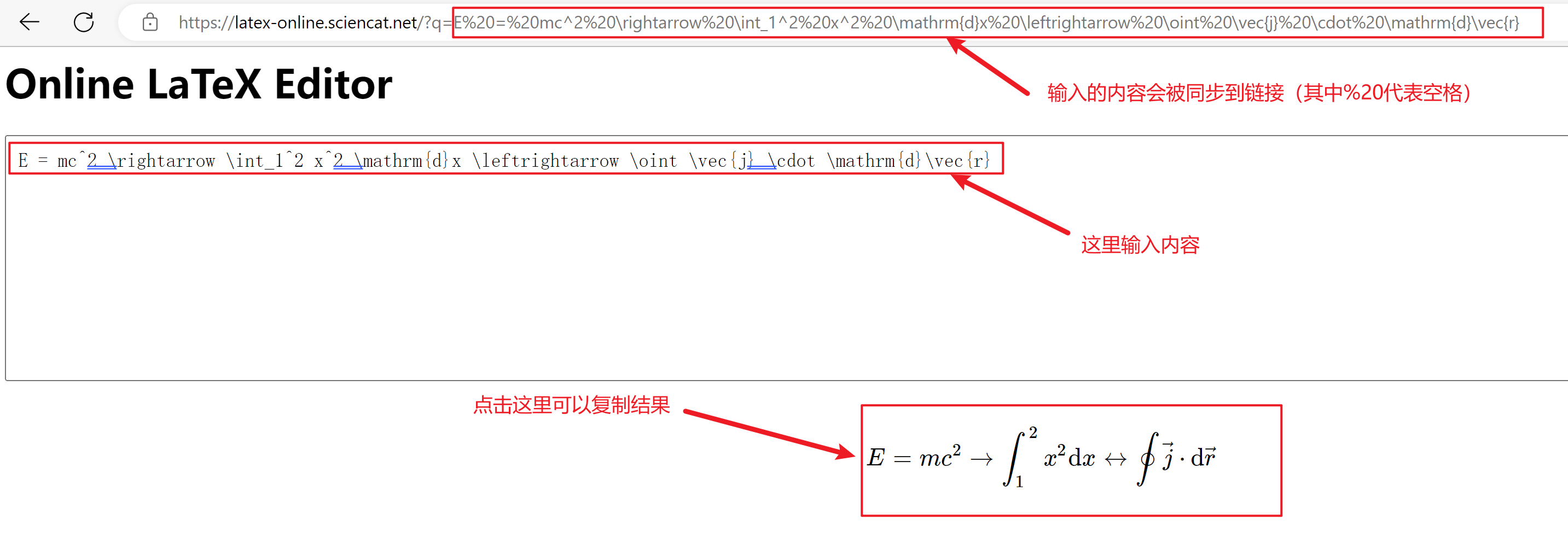 例如,我可以直接用 这个链接 给你分享一个质能方程式,只需要将质能方程式 E=mc^2 放在网址 https://latex-online.sciencat.net/?q= 后面就行。