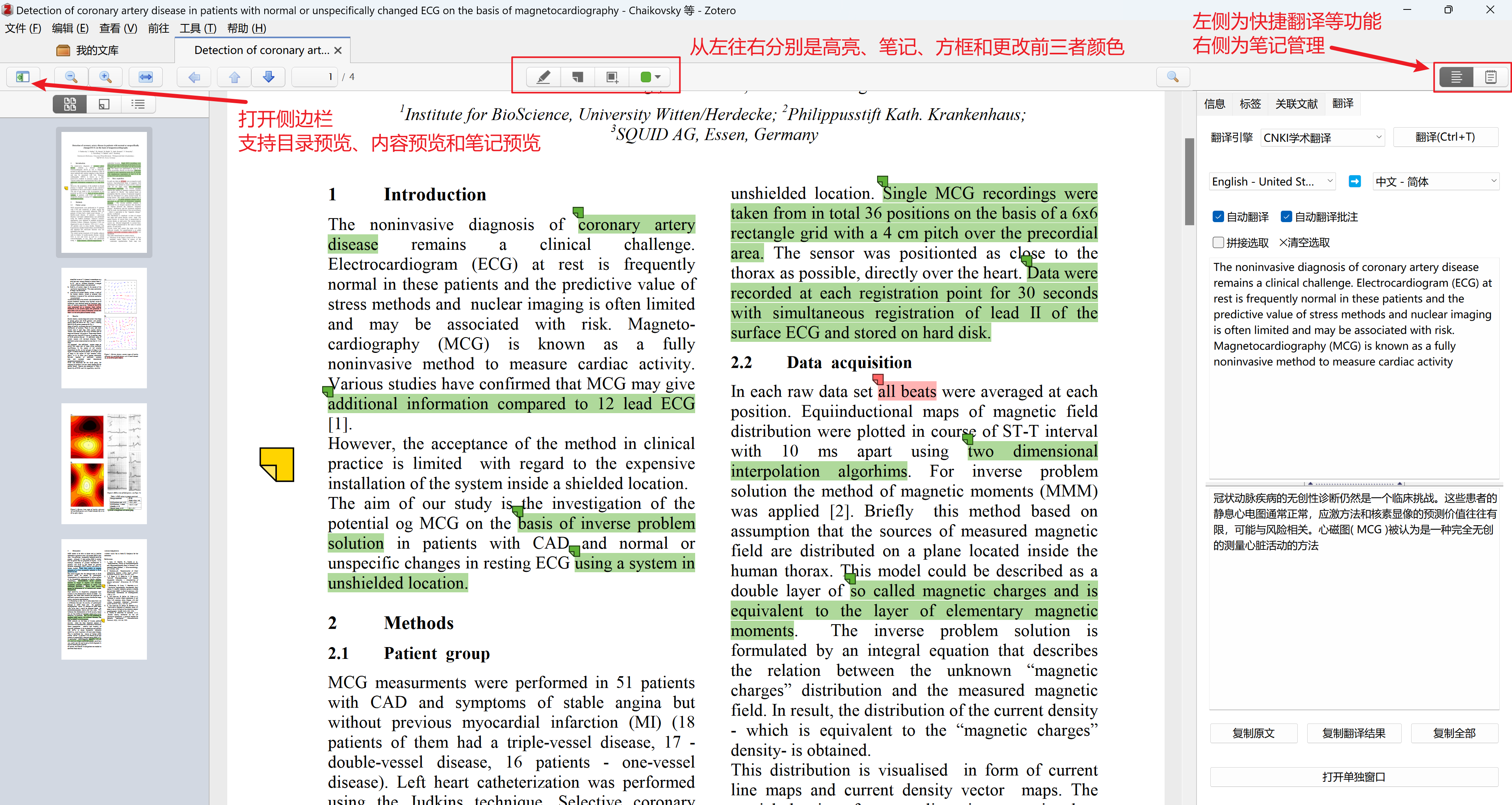 使用上,直接双击文档库中的文档,就可以用内置阅读器打开文献。阅读界面如下图所示。常见的划记高亮、快捷翻译、笔记、快捷跳转功能也都有。