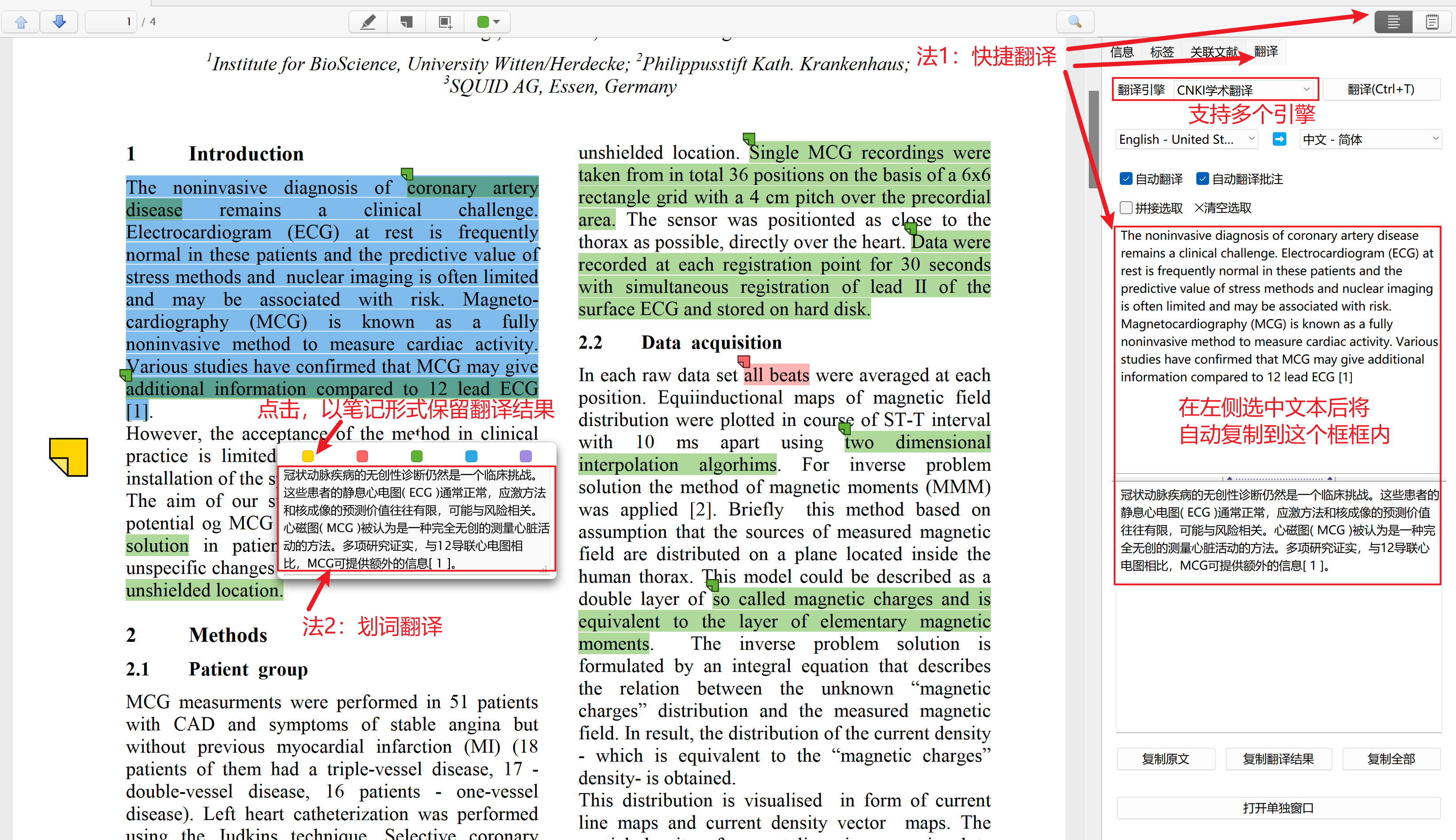 看外文文献怎么能少得了翻译功能,同样 zotero 的 PDF 阅读器也支持快捷翻译。